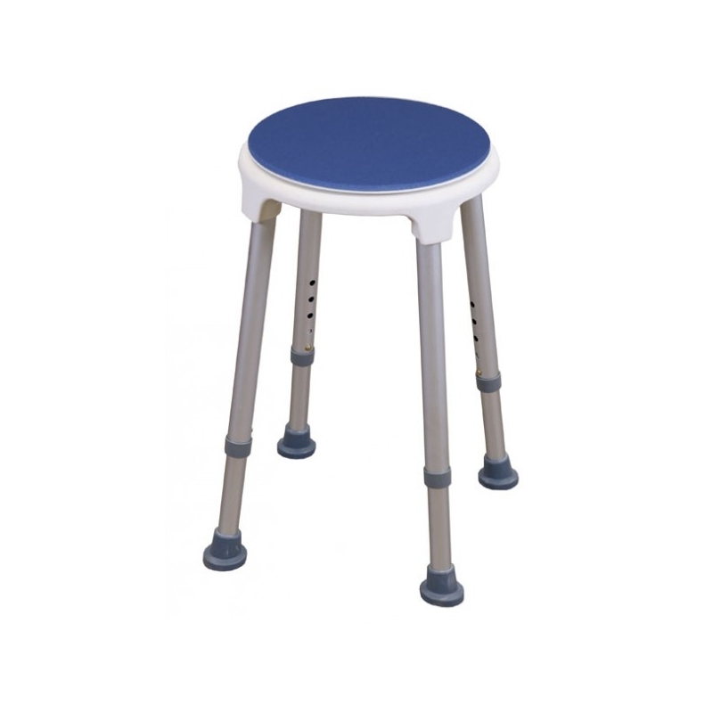 Tabouret rond Blue Seat. Fabriqué en aluminium et en plastique, avec un siège pivotant pour des transferts faciles. Il est entièrement en acier inoxydable et très léger. Il dispose de 4 pieds réglables avec des embouts antidérapants. Le siège incorpore un rembourrage souple, doux au toucher pour offrir un bon confort.
