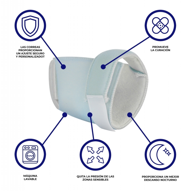 Fabriqué en mousse de 7 mm d'épaisseur. Il est doublé de velours à l'extérieur, ce qui permet de fixer le velcro sur toute la surface et d'ajuster le dispositif à la taille souhaitée pour un soutien et un confort adéquats. Il peut être placé sur le coude et le talon et peut être utilisé des deux côtés du corps.