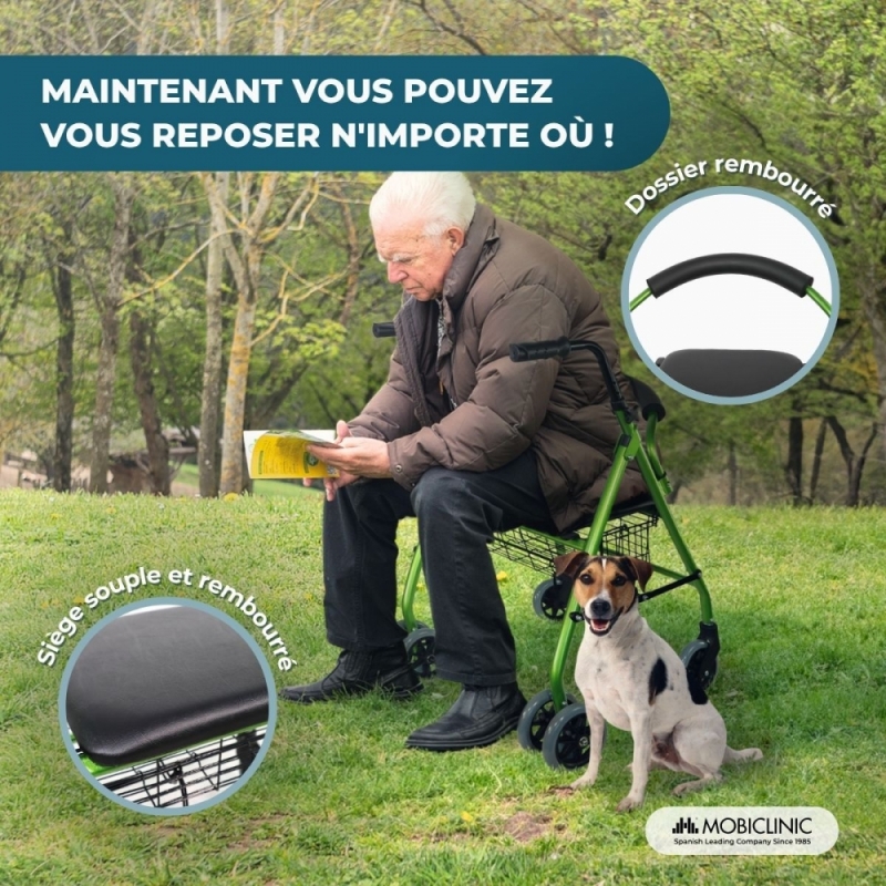 Déambulateur pliable | Siège et dossier | Aluminium | Panier | Pour les personnes âgées | Vert | Prado | Mobiclinic