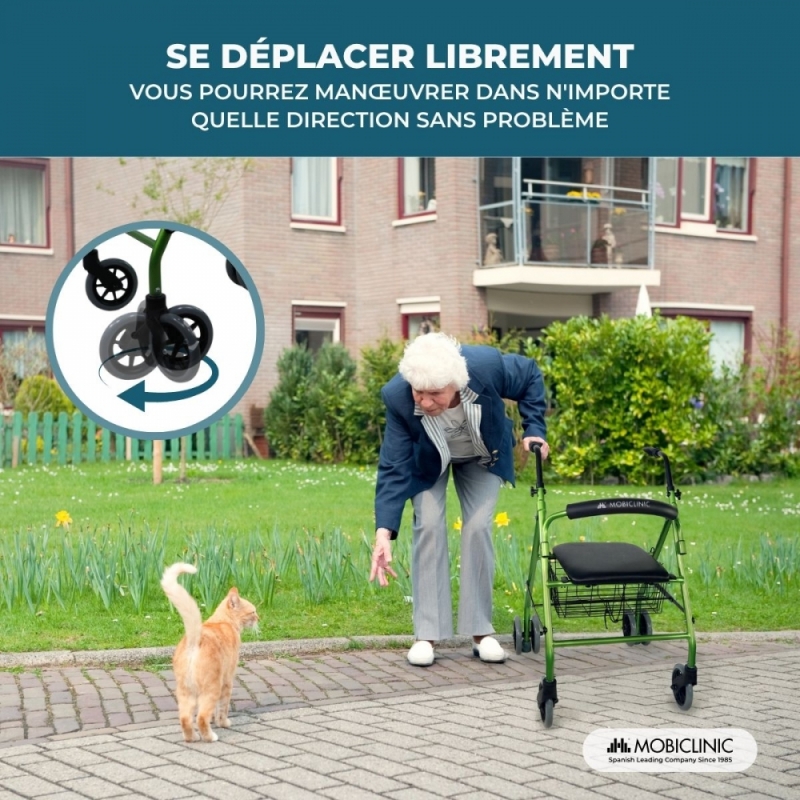 - Il est doté de deux roues avant pivotant à 360º, d'un siège confortable permettant à l'utilisateur de se reposer, d'un dossier rembourré et de freins activés par pression lors de l'exercice d'une force sur les poignées (en laissant tomber le poids du corps sur les poignées).