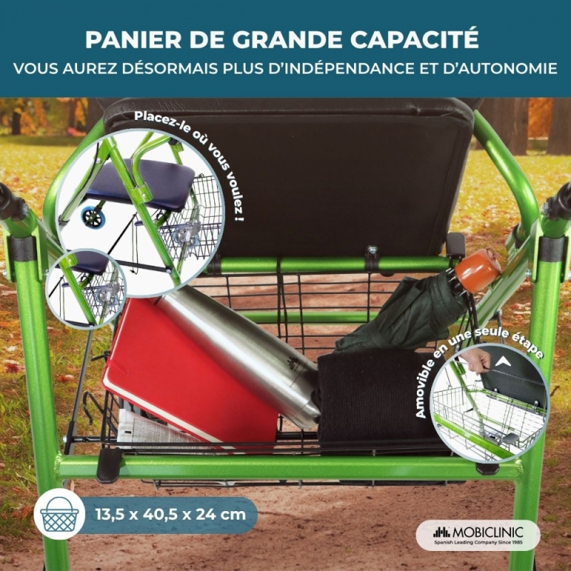 - Il dispose d'un panier à provisions qui peut être placé sous le siège ou à l'avant du déambulateur.