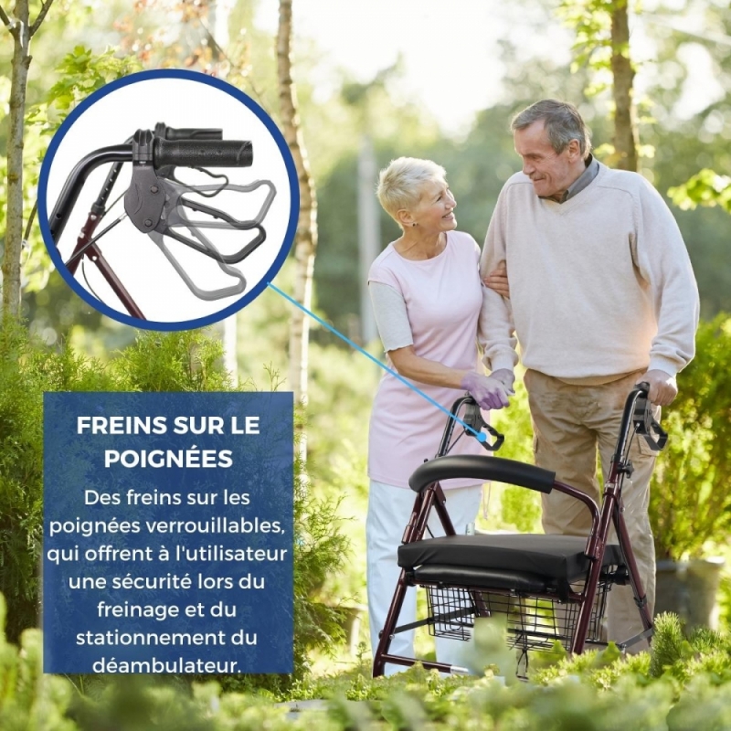 Ce déambulateur en aluminium est doté d'un siège et d'un dossier rembourrés pour assurer le confort et la sécurité, ainsi qu'un repos adéquat après l'effort. Il comprend un panier conçu pour ranger vos affaires en toute sécurité et confortablement pendant que vous marchez. Il peut être positionné soit sous le siège, soit à l'avant du déambulateur.