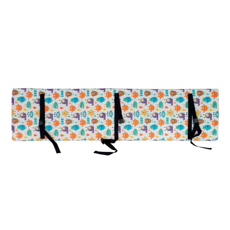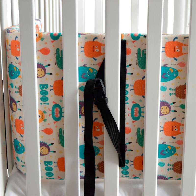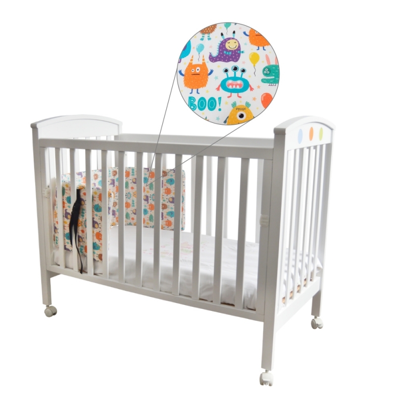 Protecteur rembourré pour les barrières de lit des enfants. Sa fonction est d'empêcher l'utilisateur de heurter les barrières en bois ou en métal du lit et d'éviter en même temps qu'il ne se coince accidentellement entre les barreaux du lit. Il est fabriqué en mousse de polyuréthane à l'intérieur et recouvert d'une housse en coton doux avec des imprimés pour enfants. Il comporte 3 boucles de réglage, qui servent à fixer et à ajuster le protecteur aux barreaux, selon les besoins.