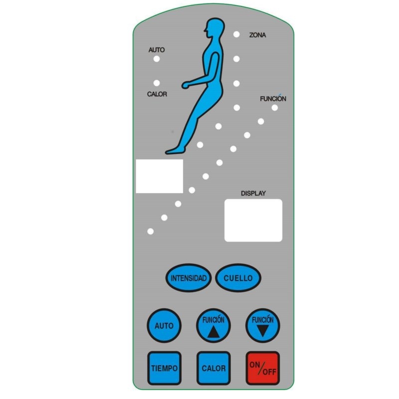 Grâce aux boutons FONCTION, vous pouvez choisir entre 10 types de vibrations, dans lesquelles les zones de massage alternent sur tout le corps. Dans la dernière fonction, la vibration est constante sur tout le corps. Le moteur de vibration de la nuque peut être arrêté lorsqu'un massage complet est effectué en appuyant sur le bouton de la nuque. Cette option ne peut pas être utilisée indépendamment.