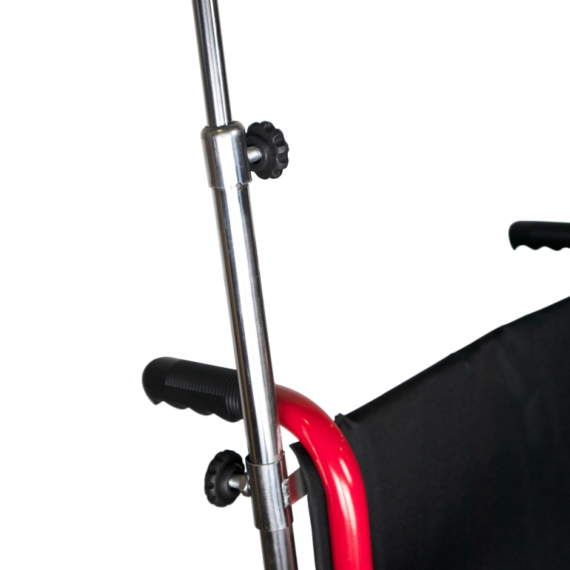 Le support compte-gouttes est un accessoire qui permet à l'utilisateur de placer le compte-gouttes sur le fauteuil roulant pliant. La hauteur est réglable de 77 à 142 cm, afin que l'utilisateur puisse la fixer en fonction de ses besoins. De plus, la partie haute pour les poches de la perfusion mesure 24 cm.