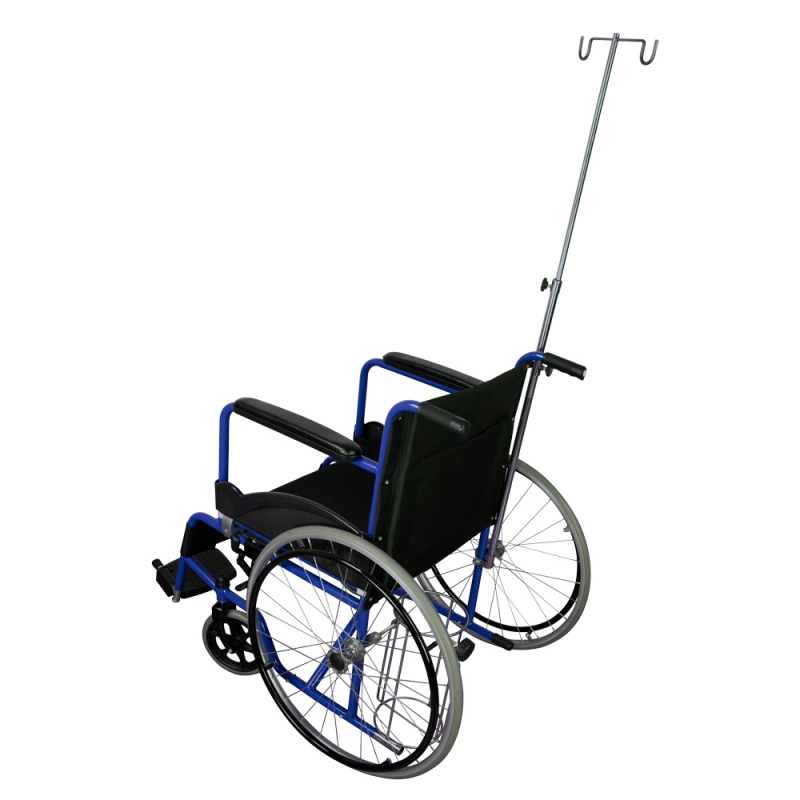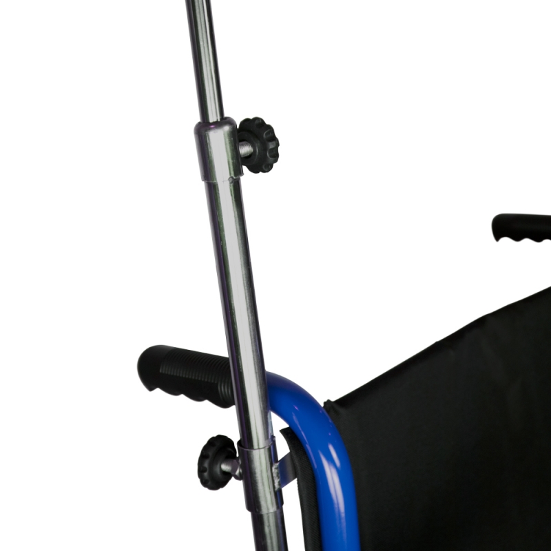 Le support compte-gouttes est un accessoire qui permet à l'utilisateur de placer le compte-gouttes sur le fauteuil roulant. La hauteur est réglable de 77 à 142 cm, afin que l'utilisateur puisse la fixer en fonction de ses besoins. De plus, la partie haute pour les poches de la perfusion mesure 24 cm.