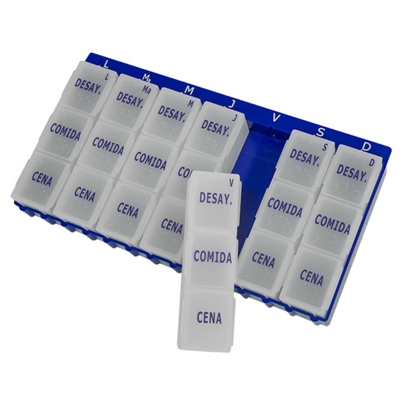 Le pilulier se compose de 7 blocs amovibles correspondant à chaque jour de la semaine. Chaque bloc se divise en trois prises et est indiqué par le jour de la semaine correspondant.