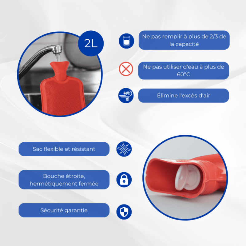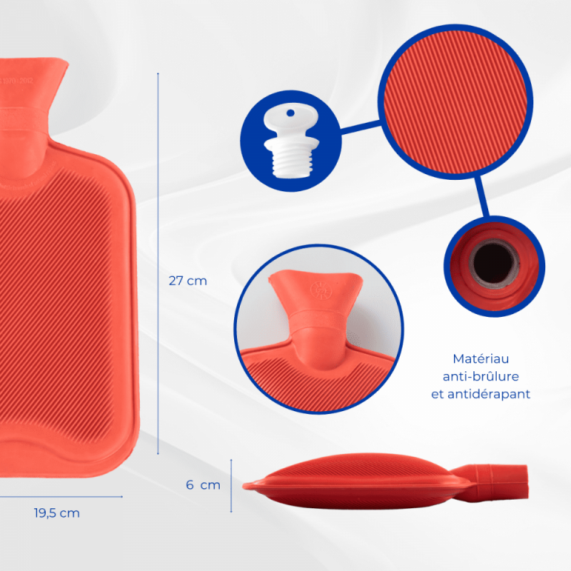 Bouillotte souple et résistante à fermeture hermétique utile pour réchauffer une zone du corps. La bouillotte avec housse est un remède très courant lorsqu’il fait froid, en cas de douleurs ou de maladie. La sécurité des bouillottes est un critère essentiel ; celle-ci possède une housse afin d’éviter les brûlures dues au contact direct.
