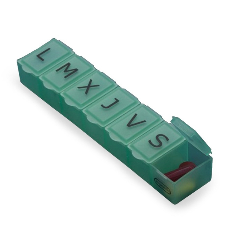 Le pilulier se compose de 7 compartiments, chacun étant indiqué par l’initiale du jour de la semaine correspondant.