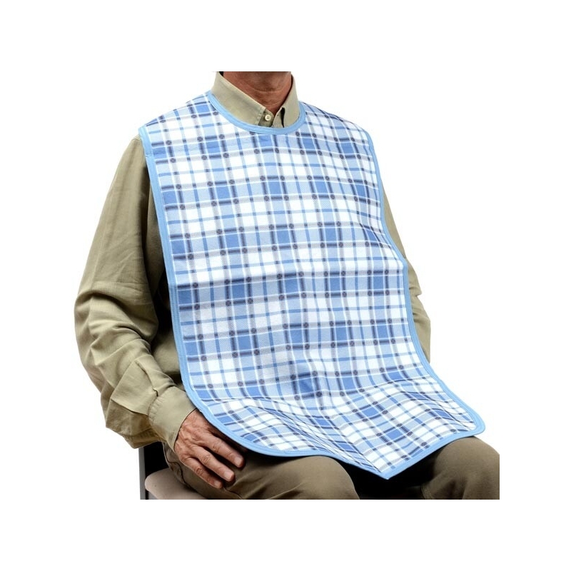 Le bavoir à carreaux, long et imperméable, est un accessoire de tous les jours pour les adultes ayant certaines difficultés à s'alimenter. Grâce à son imperméabilité, il est capable d'absorber de grandes quantités de liquides (jusqu'à 800 ml) et de protéger le patient contre d'éventuelles brûlures ou accidents.