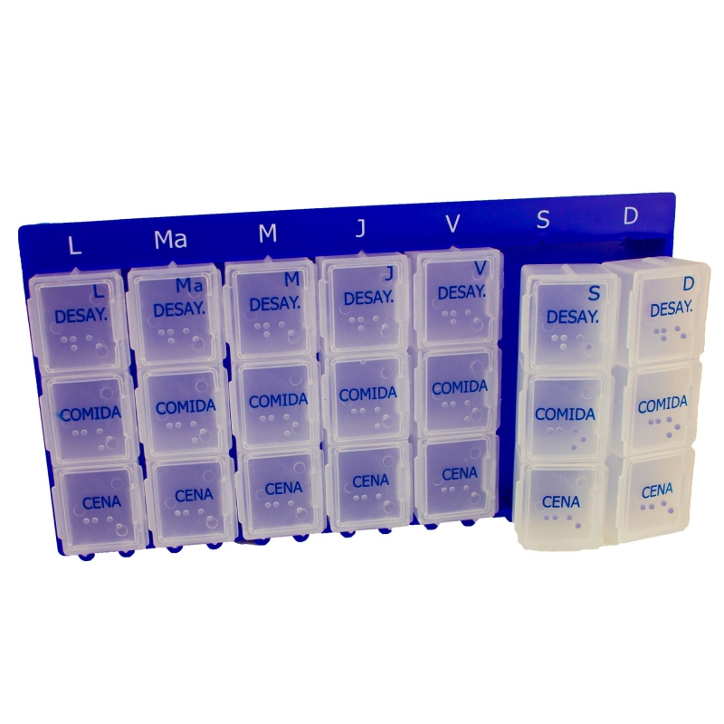 Le pilulier se compose de 7 blocs amovibles correspondant à chaque jour de la semaine. Chaque bloc se divise en trois prises et est indiqué par le jour de la semaine correspondant.