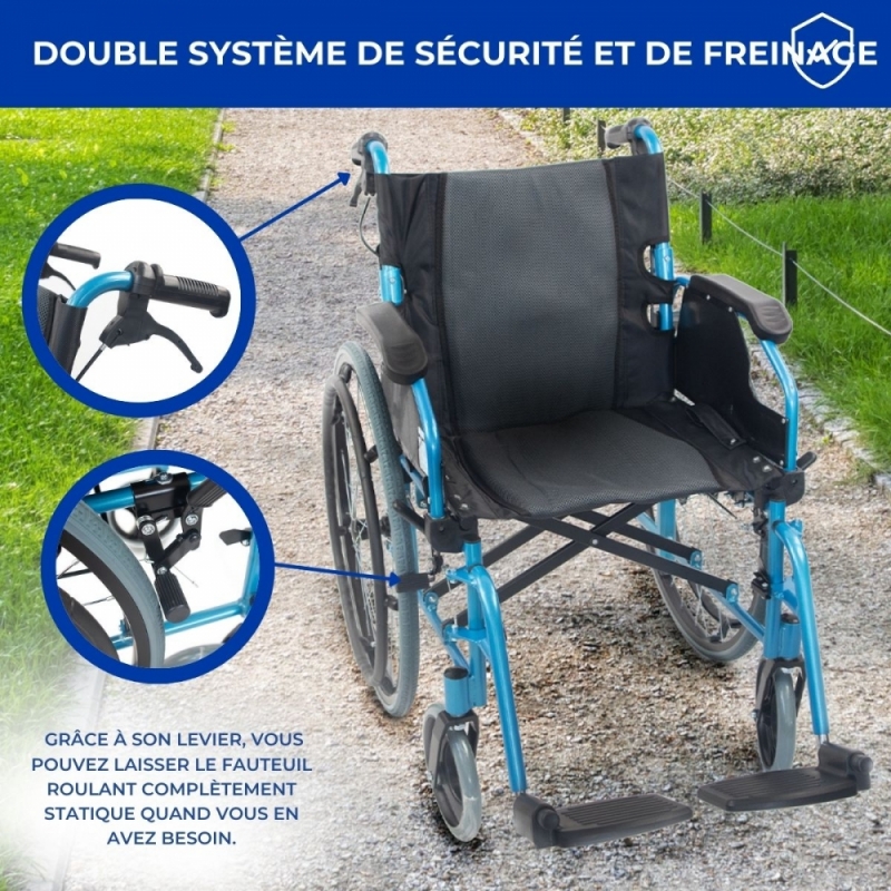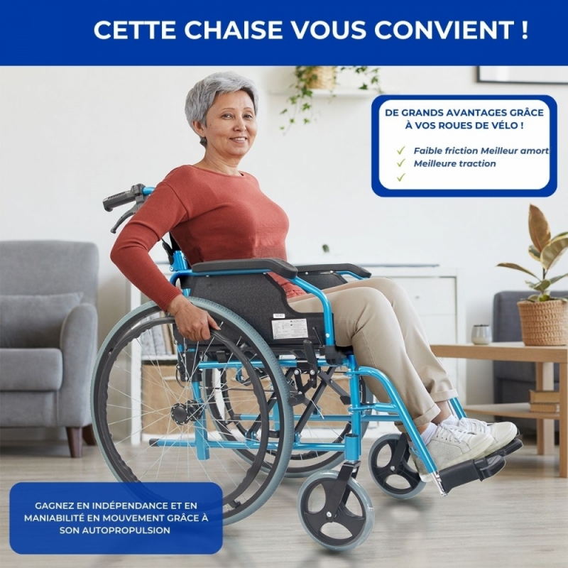 C'est un fauteuil roulant économique , doté d'une grande autonomie avec des roues qui minimisent l'effort et des freins manuels qui évitent d'éventuels renversements. Les freins manuels garantissent la sécurité, car ils empêchent le fauteuil roulant de démarrer et de se renverser dans des conditions défavorables.