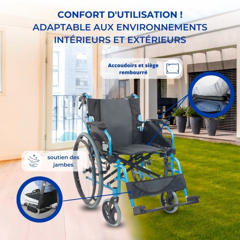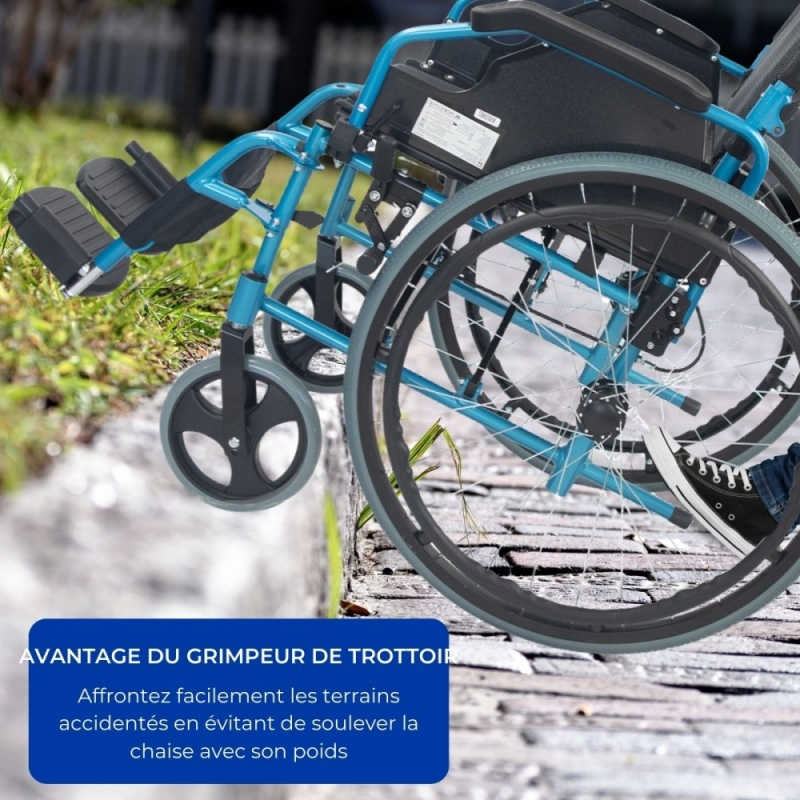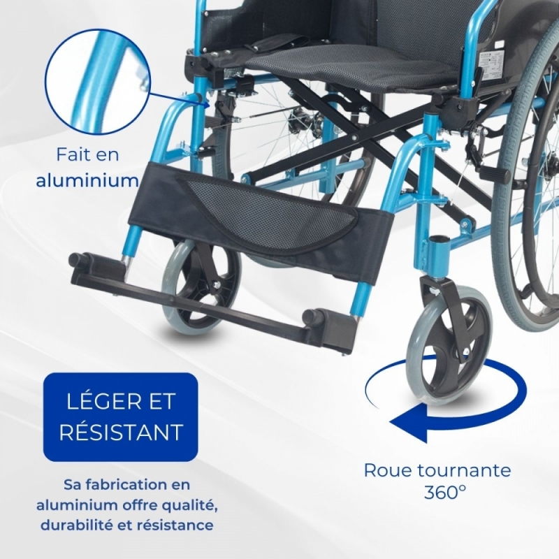 Fauteuil roulant pliant | Aluminium | Dossier divisible | Accoudoirs rabattables | Bleu | Bolonia | Mobiclinic