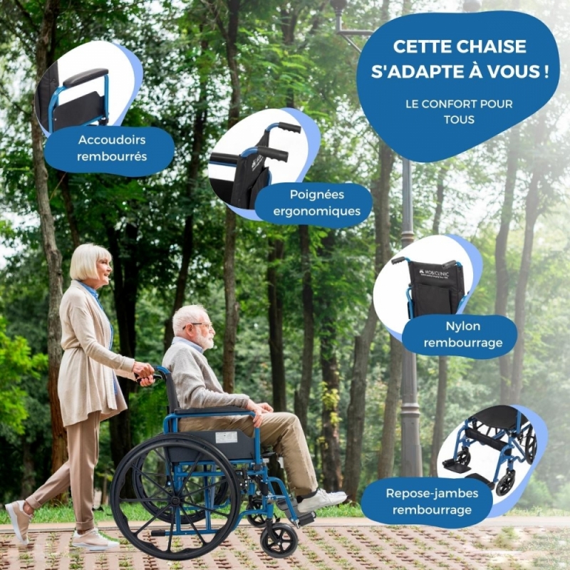 - Le fauteuil roulant est pliable pour faciliter le transport et le stockage.