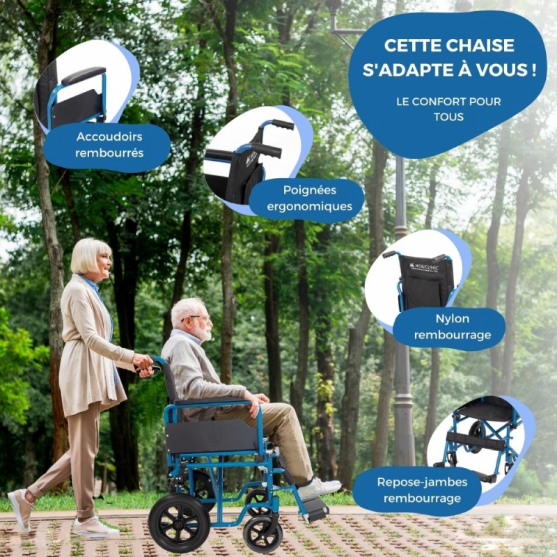 - Le fauteuil roulant est pliable pour faciliter le transport et le stockage.