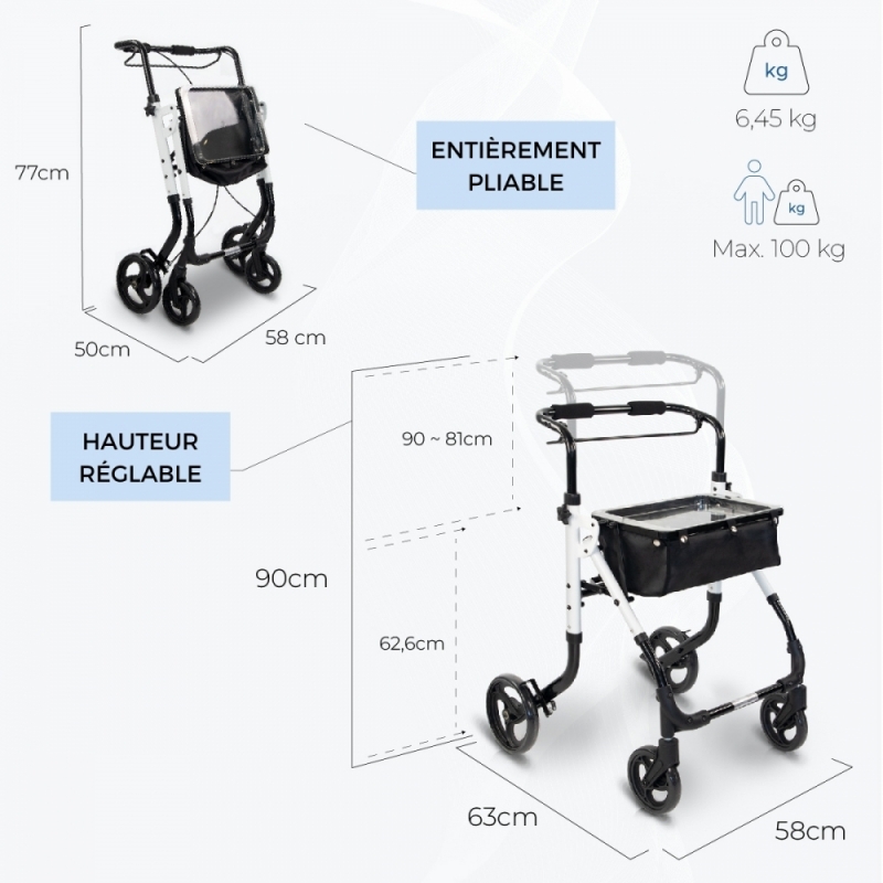 Déambulateur pliable pour âgées en aluminium | Poignée unique | Sac et panier |4 roues | Lumière | Blanc | Olimpo| Mobiclinic