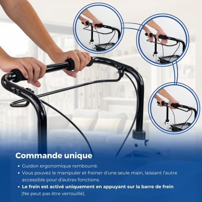 POIGNÉE À COMMANDE UNIQUE : grâce à cette fonction, le déambulateur peut être utilisé d'une seule main à des moments précis ou en cas de besoin, comme le transport d'un petit sac de courses, le transport d'un chien ou d'un enfant à la main.