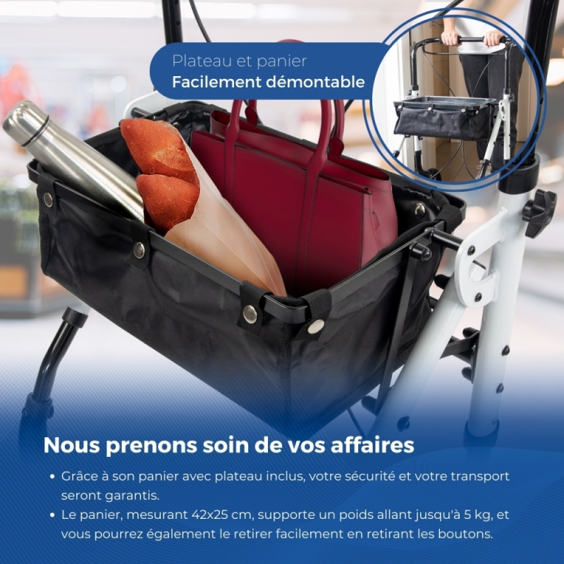 De plus, ce déambulateur pour personnes âgées, comprend des freins et un sac étanche conçu pour ranger les affaires en toute sécurité et confortablement pendant le trajet.