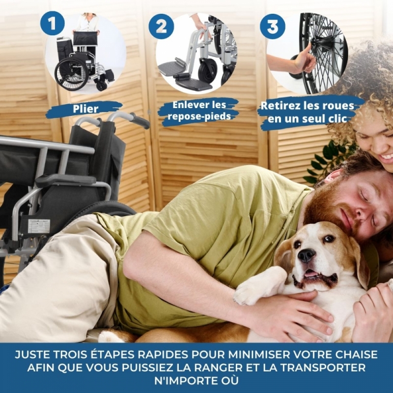 ROUES À DÉGAGEMENT RAPIDE : Ce fauteuil roulant pour adulte est facile à ranger ou à transporter car ses roues arrière incluent le système Quick Release et peuvent être retirées par simple pression sur un bouton , sans avoir besoin d'utiliser aucun outil. De plus, les repose-pieds et les accoudoirs amovibles rendent le fauteuil roulant facile à démonter et à ranger.