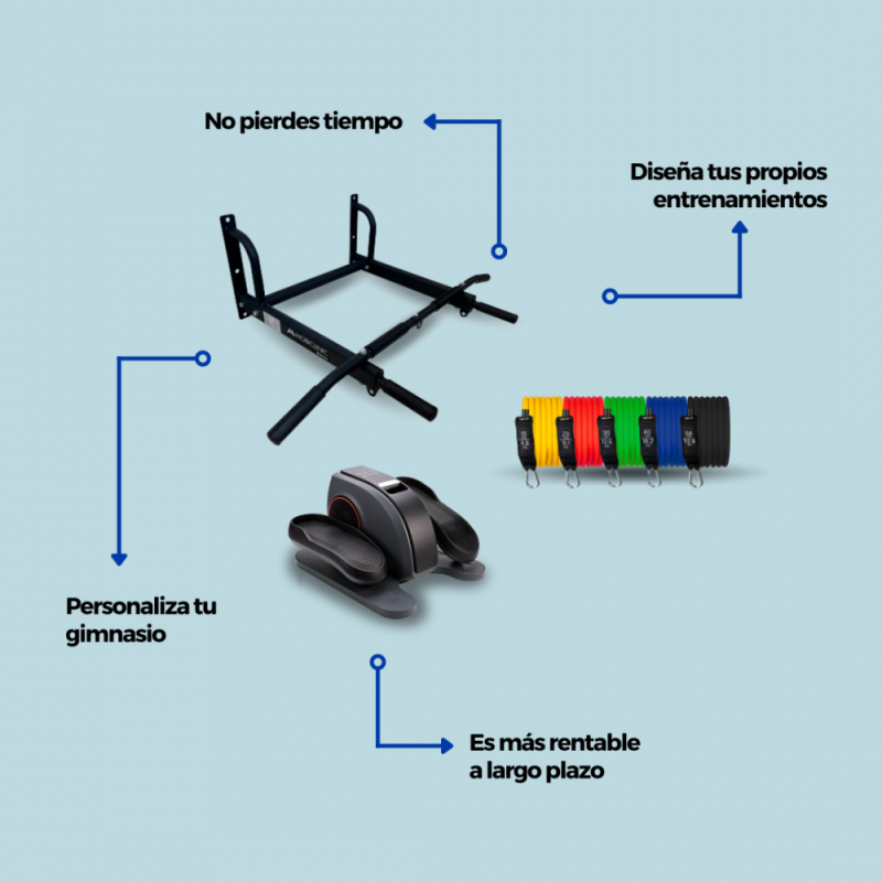 Notre pack Gym Fitness est l'ensemble parfait pour les amateurs de sport qui n'ont pas beaucoup de temps, car il est conçu pour devenir une salle de sport à domicile, bien qu'il puisse également être installé au bureau. Tout ce dont vous avez besoin, c'est d'un espace libre.