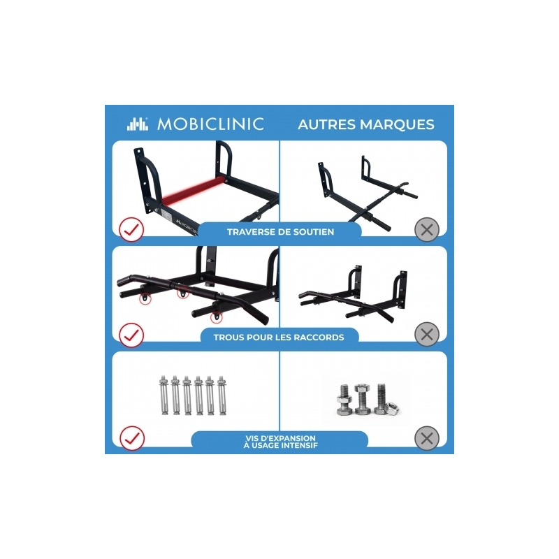 - Barre de traction : elle comprend un kit d'ancrage qui facilite l'installation de la barre. Également, différents crochets pour pouvoir y appliquer des accessoires d'exercice.