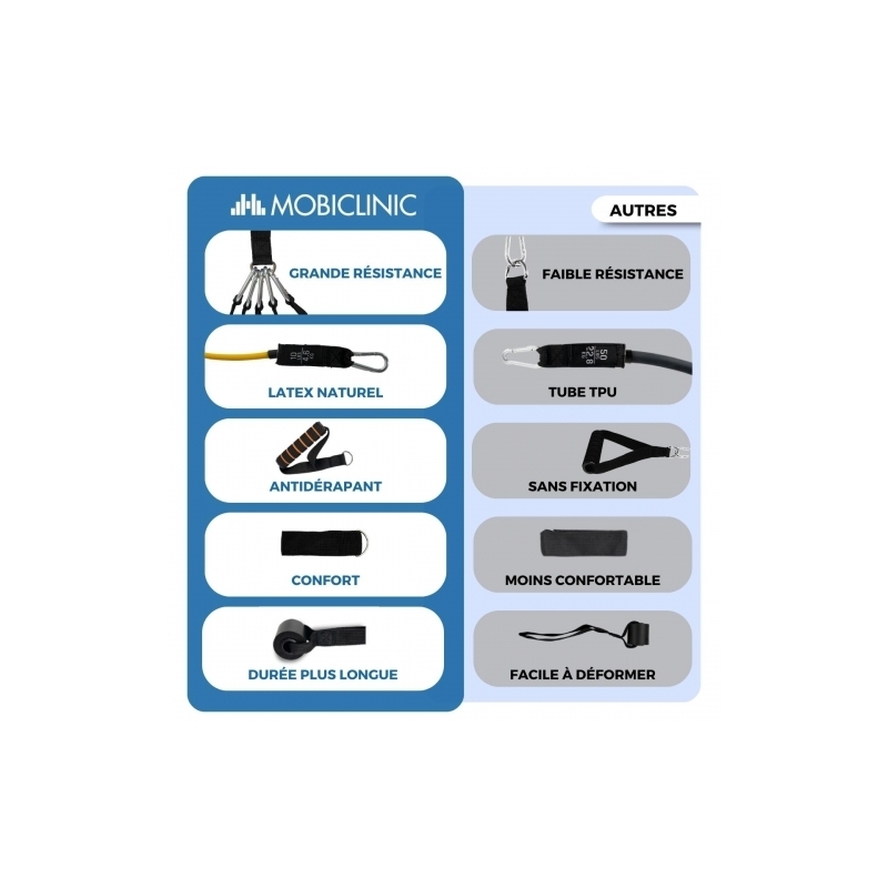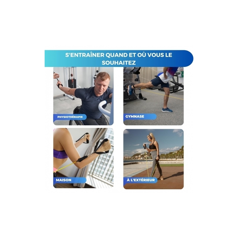 - Des tubes élastiques : ils ont un design unique en latex naturel, qui offre une plus grande résistance et flexibilité. De plus, les couleurs des élastiques de fitness peuvent vous aider à comprendre rapidement la résistance de la corde et à éviter toute confusion. Enfin, elle est dotée de poignées en mousse antidérapantes.