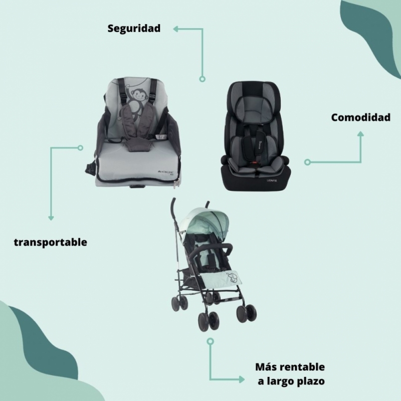 - Siège auto pour bébé Isofix : siège auto homologué et pliable avec appui-tête réglable, dossier amovible et harnais à 5 points qui maintient l'enfant en place.