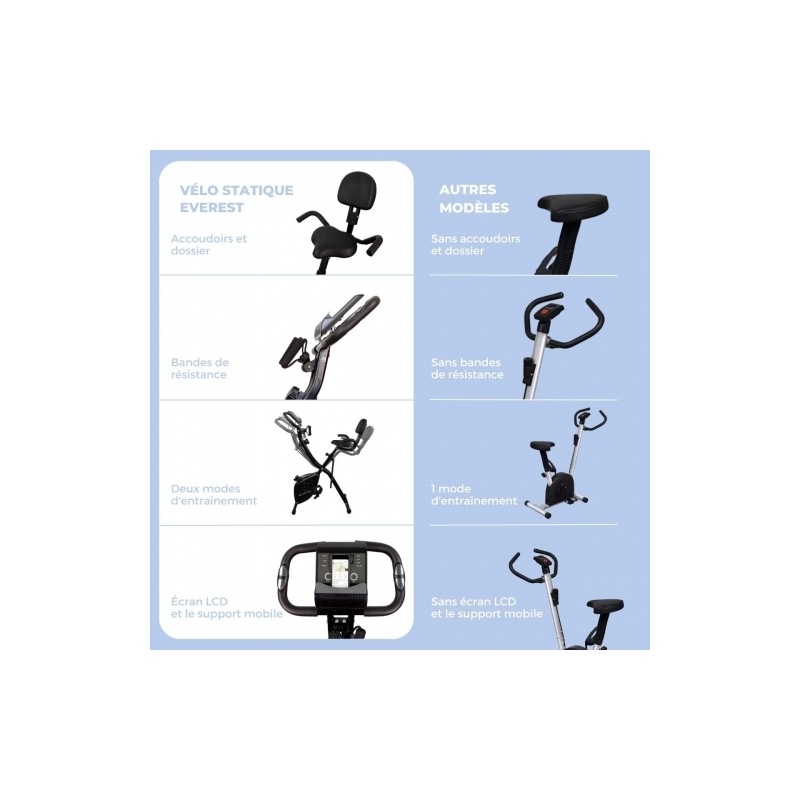 - Le vélo d'appartement EVEREST a été conçu pour les utilisateurs ayant un niveau d'amateur , puisque vous pouvez le régler et l'ajuster à travers 8 niveaux de résistance magnétique selon les besoins et la condition physique de l'utilisateur. Non seulement vous pourrez exercer vos jambes, mais vous pourrez également effectuer des exercices du haut du corps grâce aux bandes élastiques incluses.