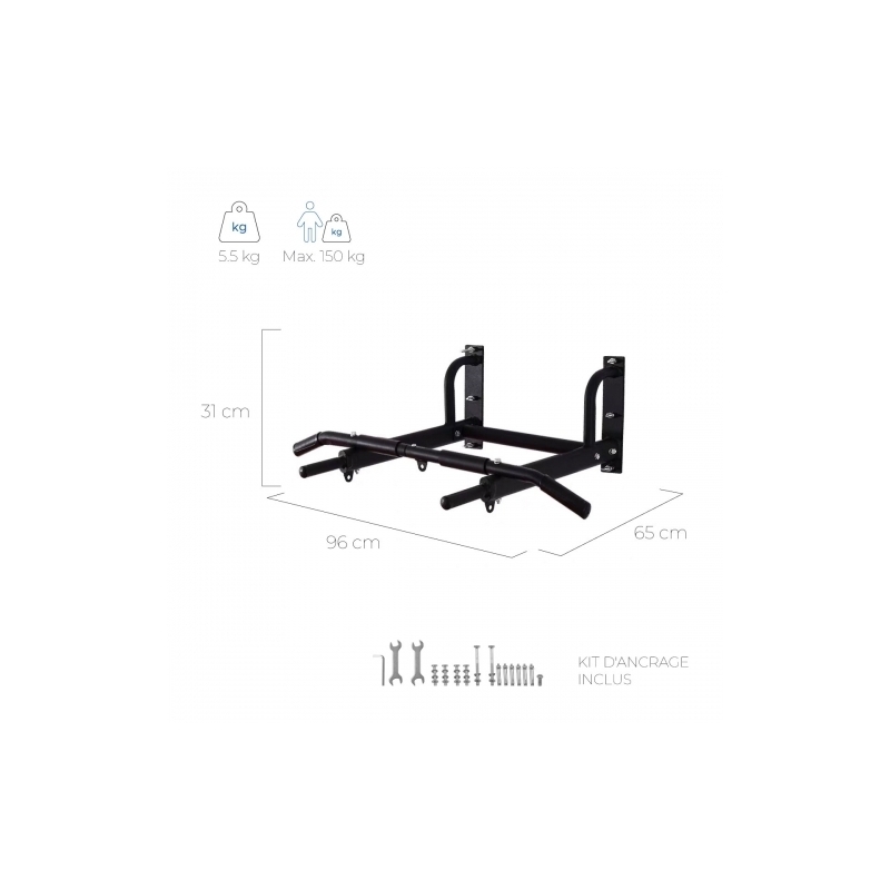 - La barre de traction a été conçue pour être ancrée au mur, offrant une grande stabilité et supportant une charge maximale de 150 kg. Pour ce faire, il comprend un kit d'ancrage qui facilite l'installation de la barre. Sa structure est conçue pour pouvoir s'entraîner de manière intensive et confortable , en étant capable d'effectuer différentes prises, telles que la pronation et la position des mains, ainsi que de faire varier la distance entre les mains dans la prise.