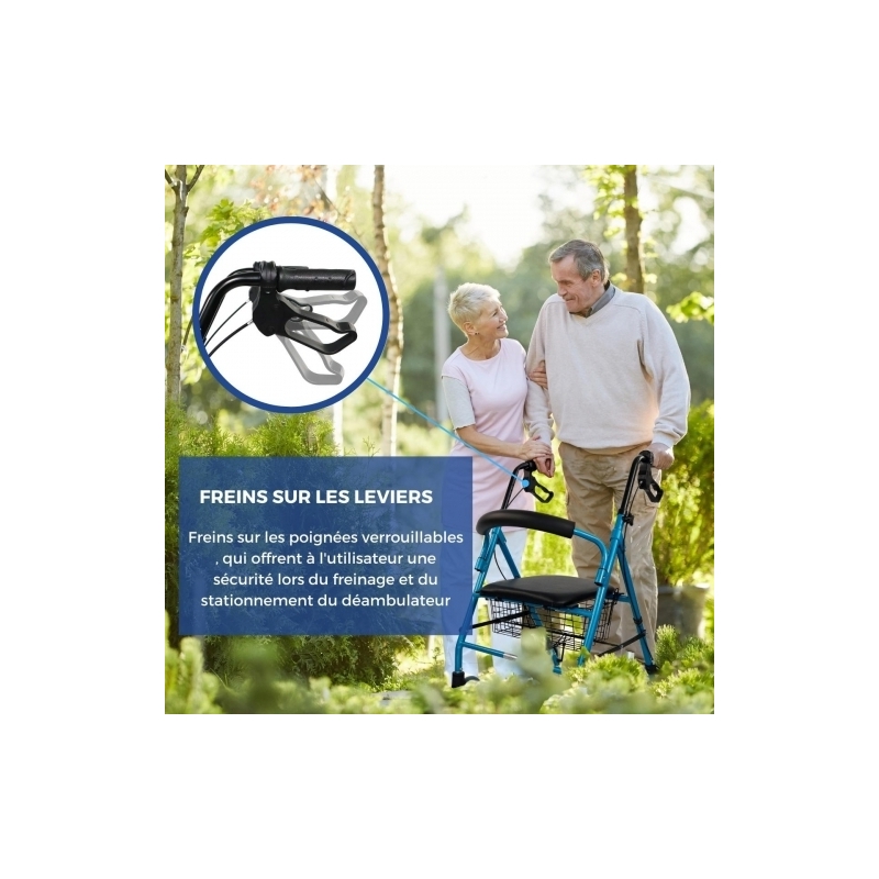 Les poignées du déambulateur avec siège sont ergonomiques et aident à répartir et à amortir le poids, réduisant ainsi la fatigue pendant l'utilisation. De plus, ils comprennent des freins à activation douce pour arrêter le déambulateur juste au bon moment et sans effort, bien qu'il offre également la possibilité de les laisser verrouillés pour garantir l'immobilisation du déambulateur, par exemple lorsqu'il est assis sur le siège. Si le déambulateur doit être complètement immobilisé, les leviers de frein doivent être tirés vers le bas et les roues seront complètement bloquées.
