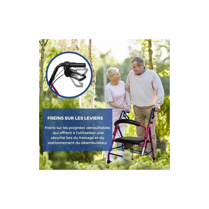 PLUS DE SÉCURITÉ ses freins à main et ses poignées ergonomiques s'adaptent pour répartir et amortir le poids lors de la marche, permettant une meilleure prise en main du déambulateur. Si le déambulateur doit être complètement immobilisé, les leviers de frein doivent être abaissés et les roues se verrouillent. Pour déverrouiller, vous devez tirer les poignées vers le haut.