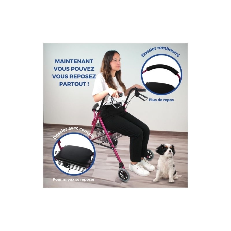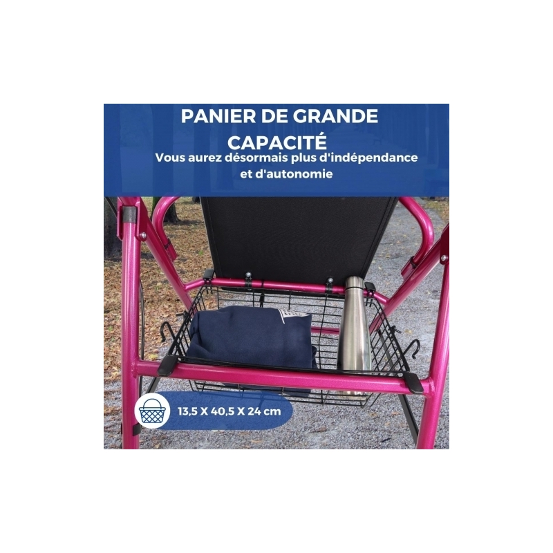 Ce déambulateur en aluminium possède une assise et un dossier rembourrés pour assurer confort et sécurité, ainsi qu'un repos adéquat après l'effort. Il comprend un panier conçu pour ranger vos affaires en toute sécurité et confortablement pendant que vous marchez. Vous pouvez le placer à la fois sous le siège et à l'avant du déambulateur.
