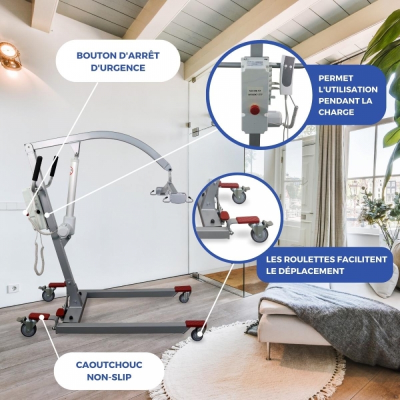 SÉCURITÉ ACCRUE : Réduit les risques de blessures ou de chutes pour le patient et le soignant. Il est équipé d'un crochet permettant de maintenir le patient pendant les transferts et d'assurer sa stabilité. Il est également équipé d'un bouton d'arrêt d'urgence permettant de lever ou d'abaisser manuellement le patient si nécessaire.