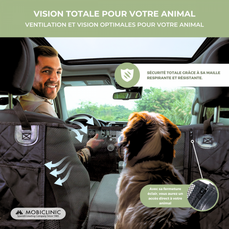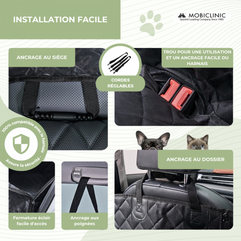 Ce dispositif de protection et de transport de votre animal est très simple à installer grâce à sa conception intuitive. Il dispose de trous spécialement prévus pour la ceinture, afin qu'elle s'adapte parfaitement à l'arrière de la voiture, ainsi que de fermetures éclair et de sangles réglables pour la maintenir sur les côtés (sur les portes).