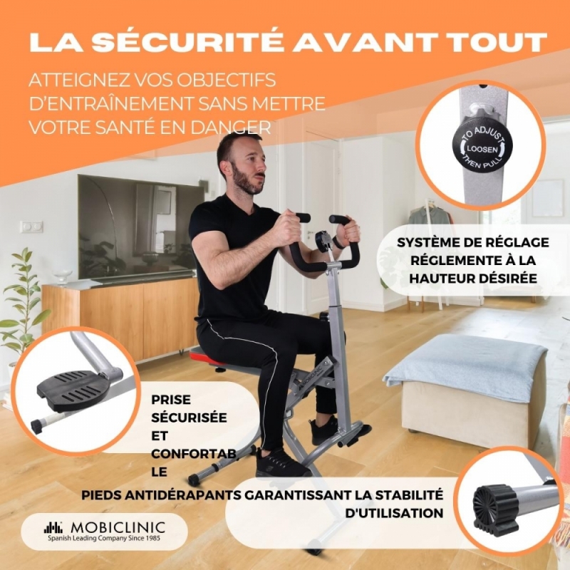 Son design ergonomique et moderne offre une double fonctionnalité, puisqu'il s'agit d'un appareil confortable avec un siège rembourré et facile à transporter et à utiliser. Grâce à son option pliable, vous pourrez utiliser ce cavalier directement chez vous ou même dans le jardin sans qu'il prenne trop de place. De plus, pour favoriser le confort d'utilisation, son guidon est réglable sur 4 niveaux différents (de 28 à 43 cm).