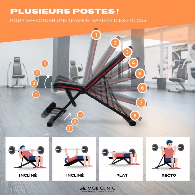 Banc d'entraînement multifonction | Pliable ultra compact | Max 200 kg | Ajustable | Poignée de transport | FlexFit | Mobiclinic