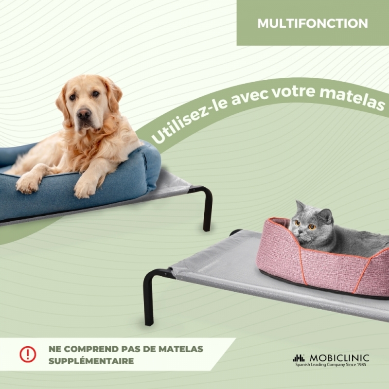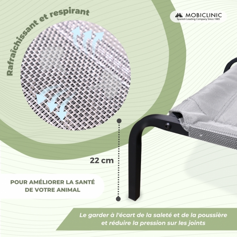 Lit surélevé pour animaux compagnie | Isolé | 122x71x21 cm | Max 60kg | Léger | Résistant | Gris | Cleo | Mobiclinic