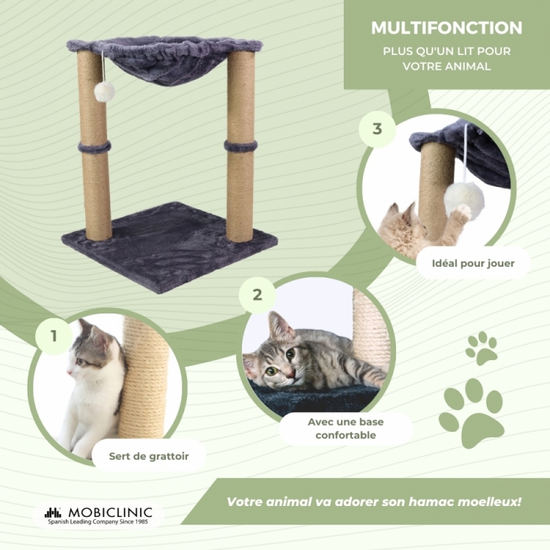 - Son design 2 en 1 , avec un griffoir et une fonction hamac pour se reposer.