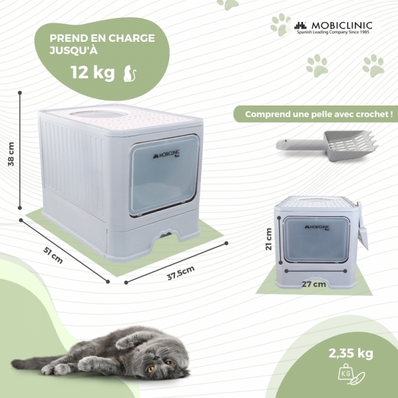 Bac à litière pour chat | Fermé | Comprend une pelle | Grande capacité | Plateau extensible et amovible | CatBox | Mobiclinic