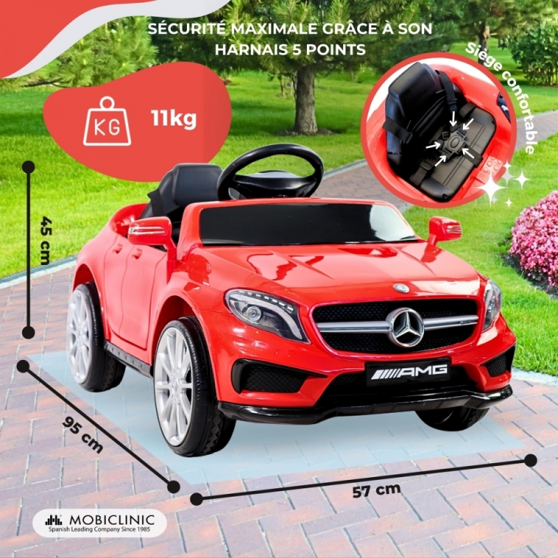 LICENCE MERCEDES-BENZ : Cette voiture à batterie pour enfants possède la licence officielle de Mercedes-Benz, en particulier le modèle AMG GLA45. Il est équipé d'une batterie 12V et peut atteindre une vitesse de 3 km/h. En fait, il présente des finitions réalistes qui captiveront n’importe quel enfant !