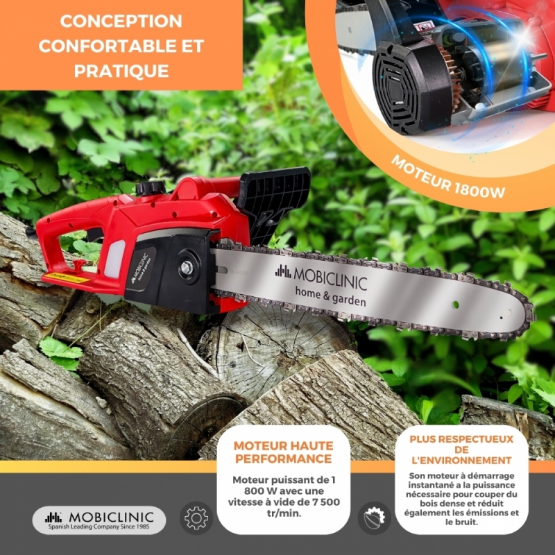 MOTEUR HAUTE PERFORMANCE : Équipée d'un puissant moteur électrique de 1 800 W avec une vitesse à vide de 7 500 tr/min, la tronçonneuse offre une puissance constante et efficace . Ce moteur à démarrage instantané fournit non seulement la force nécessaire pour couper du bois dense, mais réduit également les émissions et le bruit, rendant l'expérience utilisateur plus respectueuse de l'environnement. Puisqu’il dispose d’un moteur électrique, il est plus facile à entretenir. Il suffit de changer le balai de charbon après quelques utilisations.