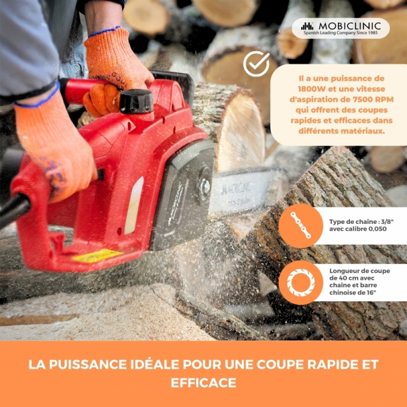 La tronçonneuse Timberpro est dotée d'un moteur électrique haute performance de 1 800 W et d'une vitesse à vide de 7 500 tr/min, cette machine fournit une force constante et efficace , coupant facilement le bois dense.