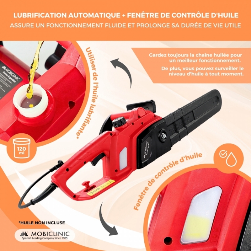 PERFORMANCES : Il dispose d'un système de lubrification automatique de la chaîne, garantissant des performances optimales et prolongeant la durée de vie utile de l'outil. Ceci, combiné à un accès facile au réservoir d’huile , rend l’entretien rapide et facile. Il y a une fenêtre pour voir le niveau d'huile. N'inclut pas l'huile. Le type d'huile utilisé par la tronçonneuse est SAE 20 ou SAE 30.