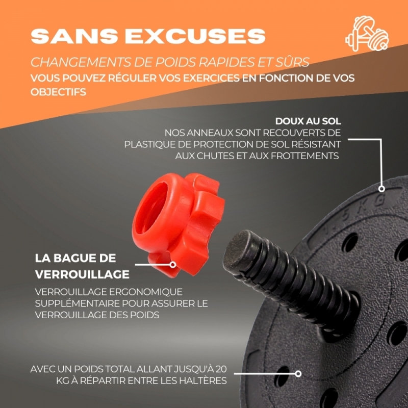 Cette paire d'haltères est idéale pour augmenter la masse musculaire, améliorer l'endurance et la santé cardiovasculaire, favoriser la perte de poids et développer la tonicité musculaire. Avec un poids total allant jusqu'à 20 kg à répartir entre les haltères , vous pourrez réguler vos exercices en fonction de vos objectifs. Les poids sont répartis en :