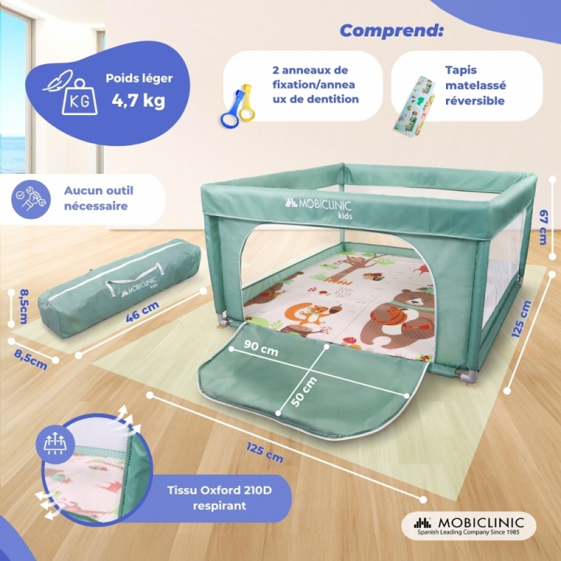 Parc avec tapis | Bébés et enfants | 125x125x67cm | Pliable | Sac de transport | Vert | Happyland | Mobiclinic