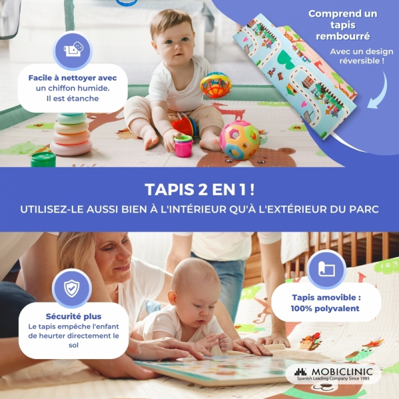 Comprend un tapis rembourré offrant confort et protection . De plus, vous pouvez utiliser le tapis aussi bien à l’intérieur qu’à l’extérieur du parc .