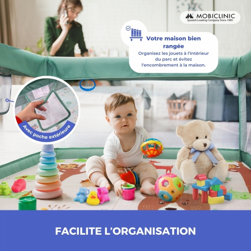 La portabilité est un aspect clé de la conception. Pliable et doté d'un sac de transport , ce parc peut être facilement démonté et réinstallé chez les proches ou pendant les vacances. Son design compact prend moins de place que les parcs en plastique et facilite son transport.