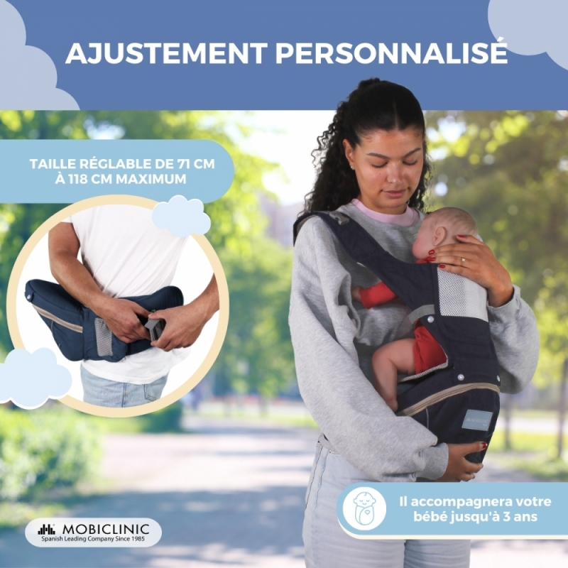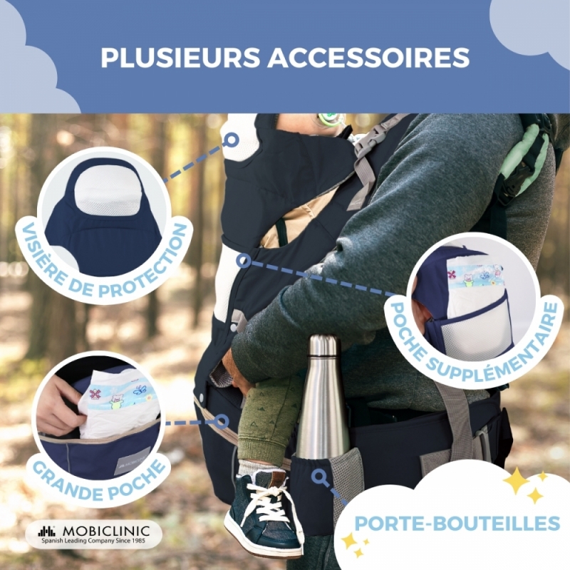 ORGANISATION ET ACCESSIBILITÉ : Le porte-bébé comprend une poche zippée pratique pour ranger facilement les affaires de bébé , permettant un accès rapide et confortable aux objets essentiels (couches, tétines, clés, mouchoirs, documentation, téléphone portable, collations, petite monnaie... .) . De plus, il dispose d'un repose-bouteille sur le côté pour plus de commodité.