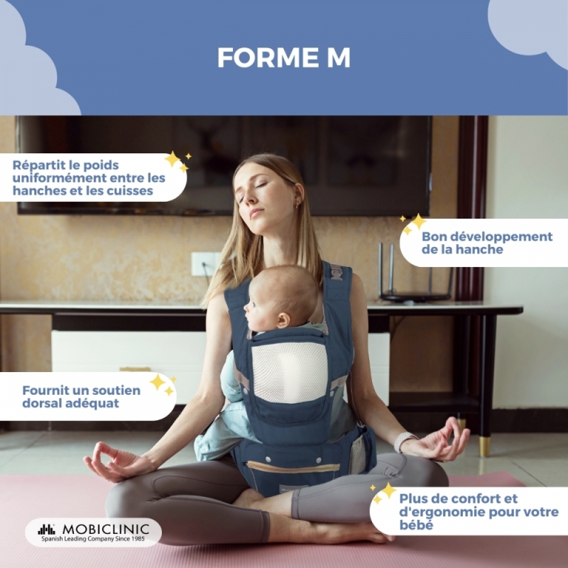 Côté ergonomie, le porte-bébé offre une position en M lorsque bébé est assis, optimisant son développement et son confort en assurant un maintien adéquat de son dos et de ses hanches. Le porte-bébé favorise la posture ergonomique du bébé en lui permettant d'adopter la position naturelle accroupie .