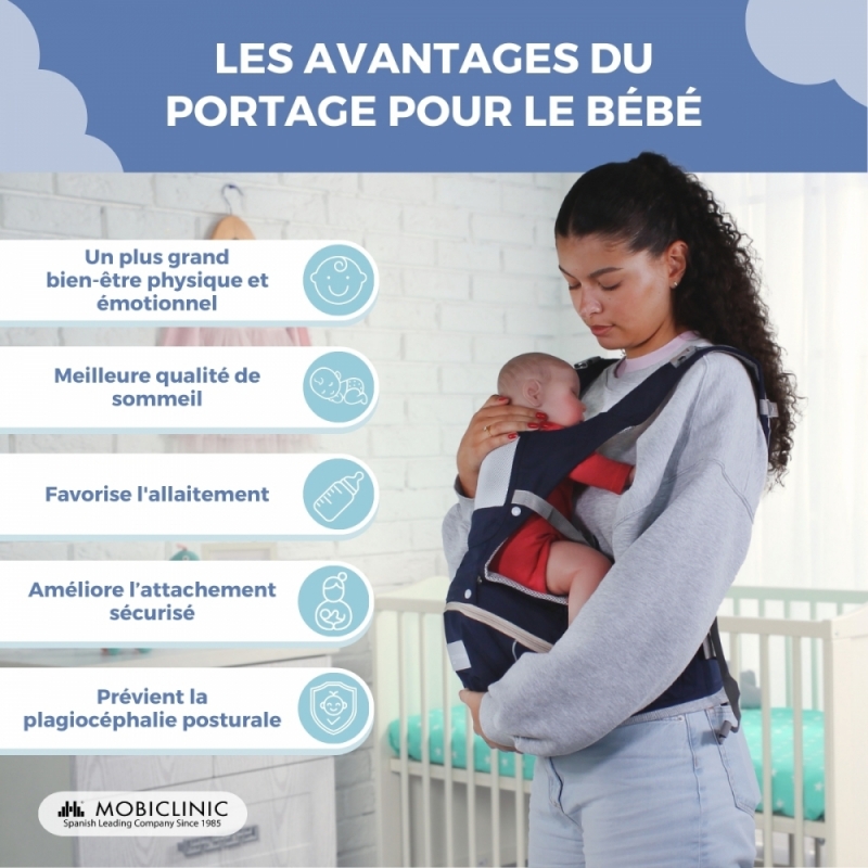 En plus de favoriser la liberté de mouvement, le porte-bébé contribue à la réduction des coliques et au renforcement des muscles du bébé , grâce à la position verticale qui favorise le système digestif et l' expulsion des gaz . Cela se traduit par des bébés plus calmes et plus stables émotionnellement, qui, en se sentant en sécurité et à l'aise, connaissent une diminution du stress et pleurent donc moins.